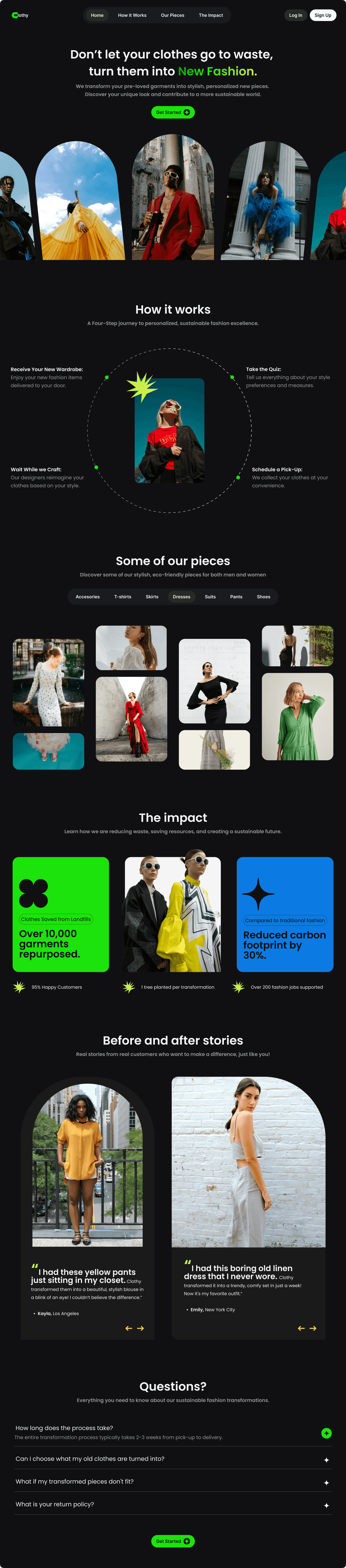 The founders of Clothy had a groundbreaking idea: to create a sustainable fashion company that transforms old, pre-loved garments into stylish new pieces. However, starting from scratch meant they had no existing online presence, no customer base, and no clear way to communicate their unique value proposition. They needed to establish a brand identity, attract eco-conscious consumers, and clearly convey the benefits of their services.